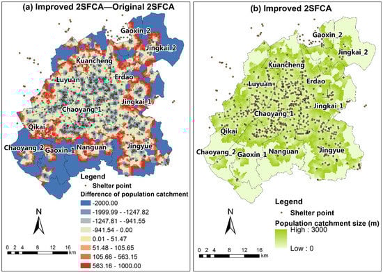 (a) Differences in population catchment sizes between the improved 2SFCA method and original 2SFCA method; (b) Catchment sizes of populations by the improved 2SFCA method.