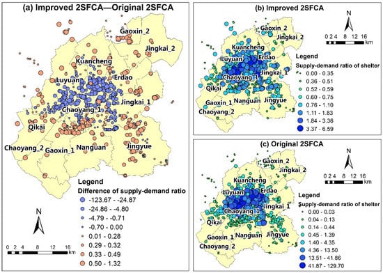 (a) Differences in shelter supply-demand ratios between the improved 2SFCA method and original 2SFCA method; (b) Supply-demand ratios of shelters in the improved 2SFCA method; (c) Supply-demand ratios of shelters in the original 2SFCA method.