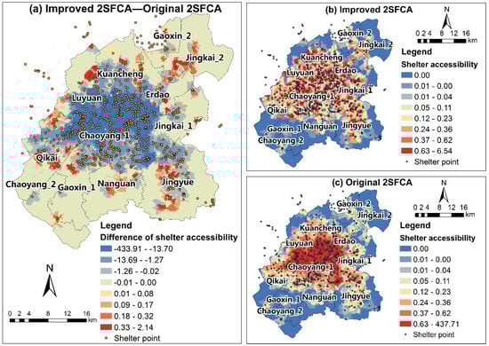 (a) Differences in emergency shelter accessibility in the improved 2SFCA and original 2SFCA method; (b) Emergency shelter accessibility in the improved 2SFCA method; (c) Emergency shelter accessibility in the original 2SFCA method.