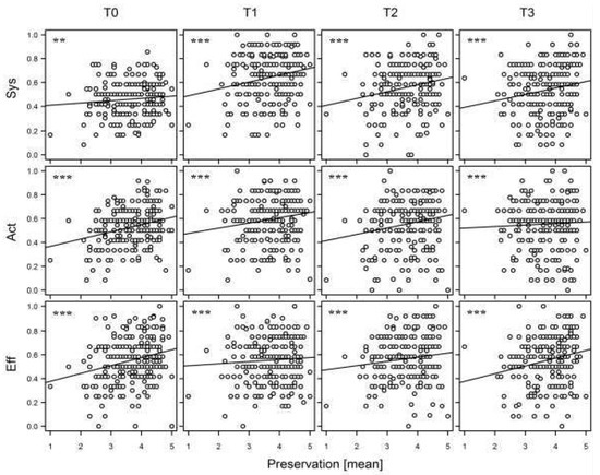 Interrelation between knowledge types (Sys system knowledge, Act action-related knowledge and Eff effectiveness knowledge) and Preservation (of the 2-MEV scale). Knowledge was at all testing points (T0, T1, T2, and T3) significantly positively related to both values (all p < 0.01) (linear mixed effects model (LMM)).