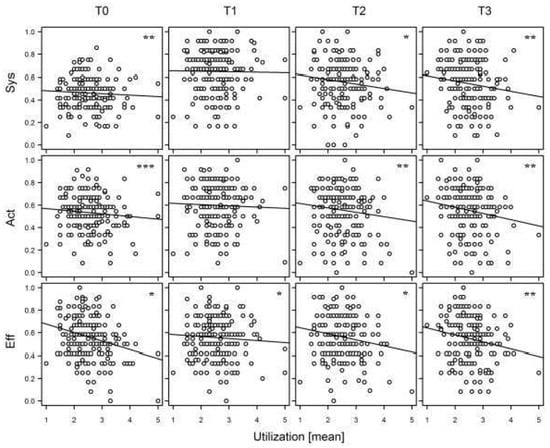 Interrelation between knowledge types (Sys system knowledge, Act action-related knowledge and Eff effectiveness knowledge) and Utilization (of the 2-MEV). Knowledge in all types was significantly negatively related to Utilization at nearly all testing points T0, T1, T2, and T3 (all p < 0.02, no relation in T1 Sys and Act p > 0.27) (linear mixed effects model (LMM)).