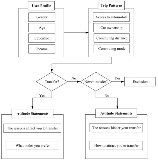 In this study, different attitudinal statements were designed to ask participants with different commuting habits to gain more realistic results. For example, there is a great difference in transfer commuting attitudes between those who have already chosen transfer commuting and those who prefer direct lines. Thus, questions should be asked from different dimensions. The detailed design framework of the survey is presented in Figure 3. The participants were divided into three parts by the questions “Are you a transfer commuter?” and “Have you ever considered transfer commuting?” If the participant is already a transfer commuter, the reasons attracting him to transfer and the characteristics of a preferred transfer node would be the meaningful questions. And if the participant is not a transfer commuter yet, but he always considers transfer commuting and he would take the transfer line if some aspects of the transfer can be improved, attitudinal statements about the reasons hindering his transfer and the methods to attract him to transfer would be presented. However, if the participant is not a transfer commuter and has a severe preference to direct line (such as a car driving preference), no more questions would be asked to them and they would be excluded from the samples.