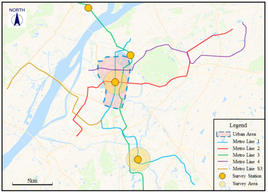An online survey was finally used to conduct data collection as it had some advantages which paper survey didn’t have, such as time and cost reductions, rapid delivery and response, flexible question design (conditional questions), and automated data statistics [7]. By the end of 2016, 133 metro stations and seven metro lines were operating in Nanjing, covering 224 km [3]. More than 50% of commuters in the central urban area use public transit. Therefore, four metro stations, a few shopping malls and several restaurants in Nanjing (118.5° E, 32.0° N), which is one of the biggest cities in southeast China owning a complex multi-level transport network including a road network, a bus system, several metro lines, and the bike sharing services are chosen to send the questionnaires during the commuting hours or at weekends in October 2017. Figure 4 shows the spatial distribution of the survey spots and areas. Respondents were asked to scan the QR code via WeChat (a popular social app in China) to enter the survey and each person could get 2 Yuan (Chinese currency unit) once the survey was completed. Finally, 486 valid samples (questionnaires) were collected, which include 132 transfer commuters and 354 non-transfer commuters.