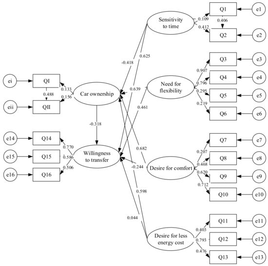 As shown in Figure 5, the willingness to transfer is dependent of car ownership while the other four factors are respectively related to the car ownership and the willingness to transfer. The need for flexibility, the desire for comfort, and the desire for less energy cost have a significantly positive impact on the car ownership, indicating the need for flexibility and the desire for comfort and saving energy would urge people to buy private cars and commute by car. The sensitivity to time is passively related to car ownership, which means commuting by car is recognized as an unreliable choice as traffic congestion is severe during commuting hours in Nanjing.
