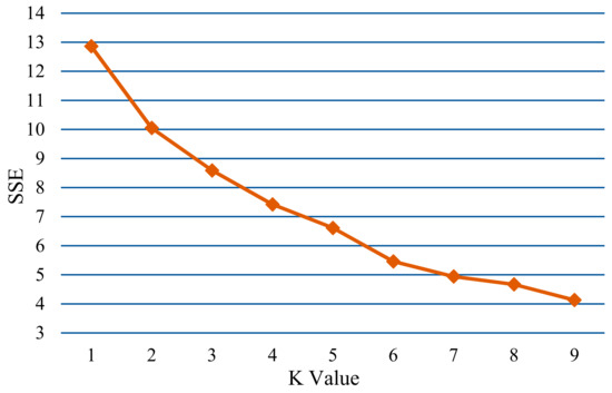 K-means clustering is the most popular clustering method world widely used. The optimal number of clusters (the value of K) is decided by the sum of squared error (SSE), which is the performance index for judging the clustering effects [45]. The less value of SSE is desirable. If the number of clusters is less than the optimal K value, the value of SSE drops sharply, while the SSE would stay steadily after the number of clusters reach the optimal value. Moreover, the number of clusters could neither be too large nor too small and each cluster should be reasonable and meaningful.