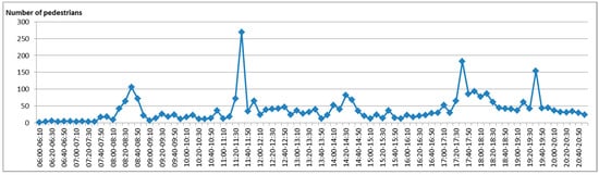 The observed road (Type A: Renai Road) was located in between universities and a retail centre. Renai Road had a simple street form, with four car lanes and two bicycle lanes in total. There was no traffic signal installed along the road. Figure 1 shows the pedestrian volume observed over one day. As expected, there was a single peak in the morning between 8 and 9 a.m.; a very sharp rise during midday; a slight peak around 2:30 p.m.; and there were two peaks for pedestrian volume observed around 5:30 p.m. and then around 7:30 p.m. Peak time was in the morning, during lunch time, and in the evening. The highest number of pedestrians counted within a relatively short period of time was during lunch time.