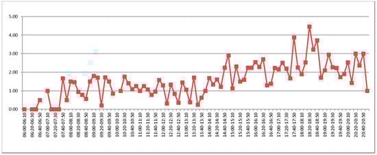 The frequent honking behaviour of vehicle drivers which is associated with traffic congestion is a major source of noise pollution in cities []. Noise from horns is the sonic expression of the presence of traffic congestion. To better understand the H index, a multi regression model was specified with the sample pedestrian crossings. The H index analysis here employed the ordinary least square method for estimation. The dependent variable was the number of Hs per unit time, 10 min (10 × H index), while independent variables were the traffic volume, i.e., the number of vehicles per unit time, and the pedestrian volume, i.e., the number of pedestrians crossing the road per unit time. Although this multi regression model included only three variables including one dummy variable, the R-squared value reached at 58.8%. The result showed that an increase in traffic volumes by one vehicle led to 0.1 more Hs (Table 3). In a similar way, an increase in the number of pedestrians led to increases in the number of Hs by 0.14. The operation of traffic signals helped reducing a noisy level as can be seen in the difference, 12.8 Hs. The observed number of Hssignified vehicle-dominant behaviour in the city.