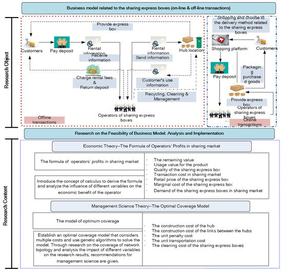 In this research process, there are mainly the following findings: (1) From the collaborative consumption perspective, the business model of sharing express boxes is feasible. From the management science perspective, the optimal overlay model considering cleaning costs, relocation costs, construction costs of hubs, construction costs of links between hubs, and penalty of costs can be solved, so it is also theoretically feasible. In practical applications, Suning Tesco and Alibaba Group have already launched the shared express box business in China. Furthermore, the promotion of this consumption model caters to the concept of low-carbon life, which is the development direction of the express delivery industry. (2) The economics guidance for the development of sharing express boxes: the development of sharing express boxes is the inevitable result of the law of value, and it is also the choice of the market. However, to achieve its sustainable development, the government should also consider its macro-control function. For example, the government can introduce advanced foreign technologies and innovate clean production technologies. At the same time, the biodegradable material can be introduced into the express packaging industry to speed up the development and transformation of packaging technology. In addition, the government can also give tax incentives to companies that use sharing express boxes to raise awareness of environmental protection in society. (3) Guidance for management science related to the development of shared express boxes: The popularity of shared express boxes is a positive effect on the concept of low-carbon life. It effectively solves the problems of environmental pollution and waste of resources caused by obsolete express packages. However, to develop this model further, it is necessary to establish a long-term supervision and management mechanism.