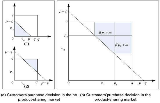 In the sharing market, there is a transaction cost (), and . Combining , can be obtained. According to the Formula (1), the demand can be calculated easily: . Similarly, . Through the formula transformation, it can be obtained that through the formula transformation, based on Figure 3a(1), customers surplus equals to zero, and there is no behavior of buying and renting sharing express boxes. According to the Formula (2), the demand can be calculated easily: . Finally, if the , there are transactions in product-sharing market. In addition, in this condition, the demand is as follows [37,38,39]: