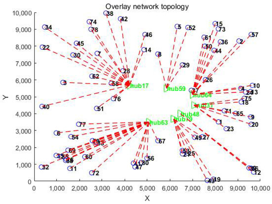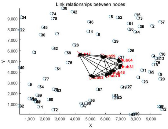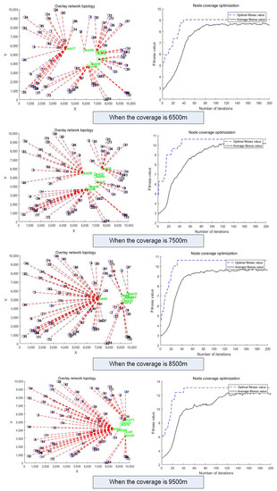 The following series of figures shows the relevant results: Figure 4 shows the coverage of the 7 selected hubs of 80 demand points, and these hubs will provide service of sharing express boxes for the remaining 73 demand points. The blue circle in the figure indicates the demand point, the green triangle represents the selected hubs, and the red line between the node and the demand point represents the matching relationship between them. In addition, to clearly show the link relationship, Figure 5 is provided, which represents the matching of hubs and demand points. According to Figure 4 and Figure 5, it can be clearly seen that hubs radiate services to the demand points centered on themselves, which constitutes a topology structure. Figure 6 is the link relationship between hubs and the connection relationship is bidirectional, indicating that the hubs are interconnected. Among them, the bidirectional black arrows of different hubs in the figure indicate the meaning. Based on these relationships, when a hub has insufficient inventory, the customer can seek services from other hubs. On the other hand, it also facilitates the management of operations. Figure 7 is the fitness curve, and it can be seen that after 60 iterations, the algorithm starts to converge and the fitness value approaches the optimal solution. Furthermore, sensitivity analysis is also conducted to analyze the effect of coverage with 1000 meters as a gradient and Figure 8 shows the network topology and fitness curve when the coverage is 6500, 7500, 8500, and 9500, respectively. When the number of hubs is constant, as the coverage increases, the hubs gradually shift to the right of the graph and gradually concentrate in this position. According to the model assumptions, customers go to hubs to rent the sharing express boxes. When the hubs are concentrated on the right side, the distance is far from the demand point on the left of the figure. This distribution will seriously affect the satisfaction of consumers and even cause a drop in demand. In addition, from the fitness curve, it can be seen that as the coverage increases, the distance between the average fitness curve and the optimal fitness curve increases. Overall, with the same number of hubs, blindly expanding the service scope of the hubs is unreasonable, which will cause waste of resources and affect customer satisfaction.