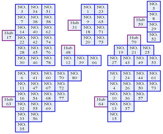 The maximum coverage solution for hub location of the sharing express boxes is represented by the following model. In addition, the objective function contains five terms: the first term is the cleaning cost; the second term is relocation costs [43,44,45,46,47]. Based on the uncertainty of node requirements, the sharing express box operator needs to periodically adjust the number of express boxes at hubs [48,49,50]. The resulting relocation costs also need to be considered, which is usually positively related to the relocation distance, relocation unit costs and relocation quantities. The third term is the construction cost of hubs; the forth term is link construction cost between hubs. The link refers to the link relationship between hubs, and the main purpose of establishing the link is to facilitate the operators to manage the hubs. The fifth term is penalty costs due to uncovered. The model minimizes the total overall cost of the five terms [51,52,53,54,55,56,57].