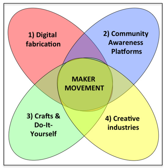 The maker movement is a rapidly expanding field with innumerable perspectives, interpretations and definitions. In the specific context of the MAKE-IT project (2016–2017), the definition of the maker movement focuses on the overlap between four main fields of activity (Figure 1).