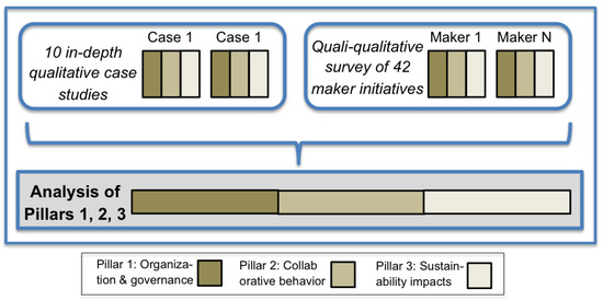 An overview of the methods and materials deployed for mapping and analyzing the maker movement in Europe is provided in Figure 2. This sketches how the overall analytical framework interacts with two main research instruments. The former consists of three analytical pillars: (1) organization and governance; (2) collaborative behaviors and (3) sustainability impact examining social, economic and environmental sustainability. The framework provides a common template for guiding the two research instruments: qualitative in-depth case studies, and a quali-quantitative survey. More details are given below.