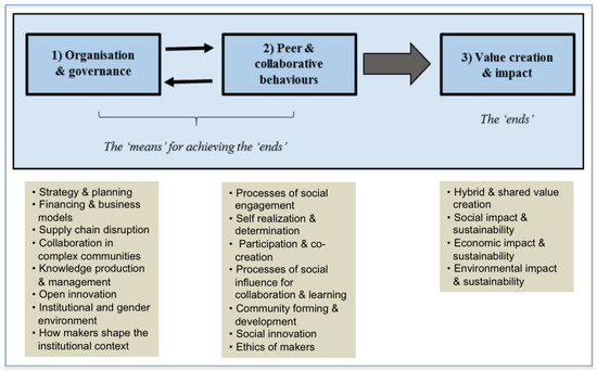 The analytical framework consists of three analytical pillars for examining individual maker initiatives and making comparisons between them: (i) how maker communities are organised and governed; (ii) what maker participants do and how they behave through peer and collaborative activities; and (iii) the various ways maker initiatives impact on, and add value to, society with particular reference to their sustainability impacts. (See Figure 3). The three pillars are ambitious in scope, and have also been shown in the project to be theoretically sound as well as highly robust empirically when examining both the internal features and the external relations and interactions of maker initiatives. Additionally, they are able to guide the examination of secondary evidence from the academic and grey literature in support of empirical analysis. As illustrated in Figure 3, the three pillars are designed to provide a comprehensive but also simple set of insights which show both the “means” by which maker initiatives operate and the “ends” such “means” produce.