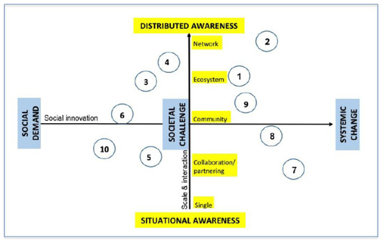 - The horizontal of x axis (marked in blue) shows the social innovation dimension derived from BEPA [14] and as described by Hochgerner [15] and Millard et al. [16]. This shows three types of social innovation.: (a) social demand as the narrowest view of social innovation outcomes focused on tackling problems in specific, possibly disparate, parts of society on a one-by-one, perhaps even piecemeal, basis; (b) societal challenge innovation at the boundary where the social, the economic and the environmental become blurred, as all actors can be involved, that are directed towards outcomes across society as a whole, and where an important focus is on the relationships between actors and outcomes; and (c) systemic change innovations that contribute, often together and cumulatively, to the reform of underlying structures, relationships and governance in society