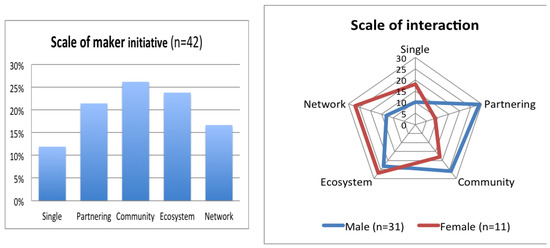 Based on the five scales that individual maker initiatives operate at, as described above, Figure 6 indicates that there is a good spread of maker scales, ranging from single initiatives that are more or less operating without significant interaction with other actors (which is the least common scale), up to makers operating in networks (the second least common). The overall distribution of makers in the sample starts to resemble a normal curve indicating that, at least on this characteristic, the sample seems to be relatively representative of makers generally. This is useful corroboration that this deductively derived scale range seems also to have relevance in practice. It is also clear from the second graph in Figure 6 that males and females are operating at quite different scales. Females are much more likely to work at the two extremes of the scale range, i.e., at the larger scales of ecosystems and networks and the smaller scale of singles, although they are also quite well represented in communities.