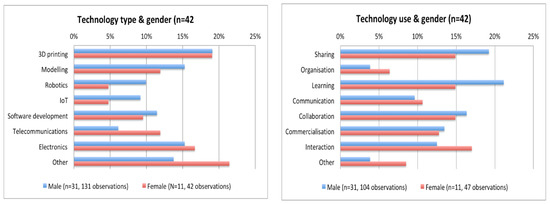 It is also relevant to examine technology types and uses by gender, as also shown in Figure 7. The overwhelming conclusion is, in fact that both males and females generally use the same technologies to a similar extent. However, Figure 7 does indicate that males are a little more likely to be involved in modeling, software development, robotics and the Internet of Things (IoT), each of which is perhaps a more specialist technology in the maker context. Generally, females tend to use a wider range of technologies and to be less specialized in their technology use, as also indicated by the higher incidence of the “other” category.