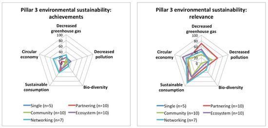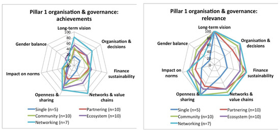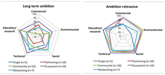 Moving to ecosystems and networks, these larger scale initiatives seem almost always to achieve much bigger impacts than smaller scale initiatives. However, ecosystems outperform networks in terms of the peer and collaborative behavior pillar as well as in social sustainability and economic sustainability, perhaps because they consist of well functioning local or regional clusters of complementary and diverse actors. Networks, however, outperform ecosystems in terms of the organization and governance pillar and environmental sustainability, possibly because they sometimes have an even large scale and much learning between similar initiatives given the need to challenge many more incumbents, infrastructures and norms than the peer and collaborative behavior pillar, or social and economic sustainability, at least in the early stages of maker development. Even though ecosystems are not necessarily at the largest potential scale, they can be thought of as exhibiting the most intricate, comprehensive and developed set of relationships between different, but complementary, actors at a relatively large scale. Such relationships are typically at the heart of an innovative milieu. When successful, ecosystems are therefore likely to be very ambitious and to see all ambitions as highly relevant.