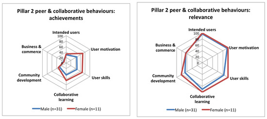 In relation to the organization and governance pillar, females report both greater achievements and greater relevance on gender balance compared to males, though this remains on the low side for both. Females also report greater achievements on openness and sharing, whilst males feel they are achieving a little more on changing prevailing norms, policies and regulations, on their long-term visions and on financial sustainability. In terms of the peer and collaborative behavior pillar, females report much higher aspirations (given by their relevance scores), and are in practice achieving much more on user motivation, user skills and collaborative learning, compared to males. Overall, females have a higher focus on social and educational issues, on openness and sharing, skills and quality of life, whilst males focus more on technology, industry/economy innovation and changing regulations, norms, etc.