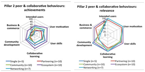 Similar to ambitions, the achievements actually being delivered are generally higher for the peer and collaborative behaviors pillar than the organization and governance pillar, again perhaps underlining the still relatively early stage of development of many maker initiatives. This result is further underpinned by the fact that the overall focus of achievements tends to be on the more bottom-up and sometimes informal individual aspects of the peer and collaborative behaviors pillar (like user skills and motivation, sharing and learning) than on the more top-down and formal organizational aspects (like management, decision-making, impact on wider institutional norms, including policies and regulation) of the organization and governance pillar.