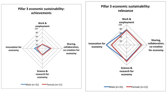There are only minor gender differences shown in Figure 17, with the most prominent being greater male economic sustainability achievements in innovation for the economy, but slightly less than females on sharing, collaboration and co-creation.