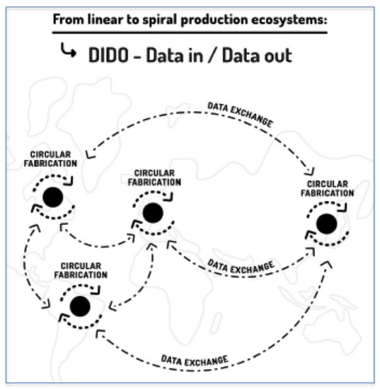 The most prominent current manifestation of the maker movement are Fab Labs which have emerged as spaces for democratizing digital fabrication. Here people learn how to design and make with tools and machines that work with the interactions of ICT, physical and biological processes and materials [22]. The maker movement and the Fab Lab network is now being envisaged and extended at city scale and networked globally for the purpose of ensuring that Industry 4.0 will be efficient, effective, as well as socially and environmentally sustainable. According to the Fab City whitepaper [23], cities should rapidly move towards being locally productive and self-sufficient whilst globally connected. (See Figure 21) The 18 members of the global Fab City network are committed to moving from the current linear industrial production model, which imports raw materials and products and exports waste and pollution, towards a spiral innovation ecosystem in which energy and materials flow locally within cities, whilst information and data (including on how things are made) circulate globally.