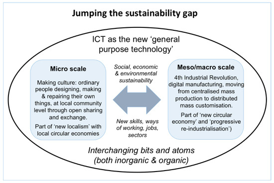 The jury is out on whether the maker movement will be midwife to the next industrial revolution by moving from centralized to decentralized distributed manufacturing, as claimed for example by Anderson [1] and by Olivier Scalabre more recently (See above). The World Economic Forum itself is, however, presenting a range of views. On the one hand, it argues that indeed the scaling up of the maker movement, for example by becoming part of Fab City ecosystems, is leading to sustainability through resilience and circularity—arguably the two most critical features of future-proof societies. Over the last decade the movement has morphed into a global ecosystem for prototyping software-hardware integration, leading to on-site manufacturing becoming an effective way of reducing carbon footprint. In the process, the maker movement through its humble Fab Lab beginnings is helping to strategically re-generate marginalized areas through progressive re-industrialization [27]. On the other hand is the more balanced view that 3D-printing will not replace mass manufacturing but rather supplement it. Even in the midterm, a mix of technologies and supply chains will be needed. 3D-printing generates significant value in the field of highly personalized goods and to meet demand for smaller quantities at affordable prices. However, it will still be too expensive and cumbersome to meet the demands for very cheap standardized products and, in the context of growing world trade, standardization is critical to keep prices low as well as keep quality and reliability up. Thus, more likely is that manufacturing develops in two phases: the base products will be mass-manufactured, while finalization and personalization will happen in or close to the market, both geographically and culturally [28]. Some of these tensions, challenges and indeed opportunities are illustrated in Figure 22. This attempts to capture and summarize much of the evidence and discussion in this paper as to how ICT is being used as the new “general purpose technology” to help “jump the sustainability gap” in how goods are made between the bottom-up, small scale maker movement and the larger city- and global-scales of Industry 4.0.