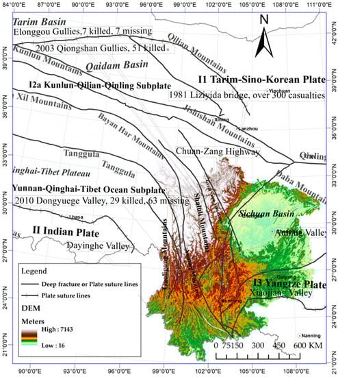 This study area is located within the subduction zone between the Eurasian Plate and the Indian Plate (Figure 1). The movements of these continental plates provide this region with a dense distribution of tectonic belts and intense seismic activity, which produces fractured mountain bodies, causes rock debris increase, and supplies the region with abundant debris reserves.