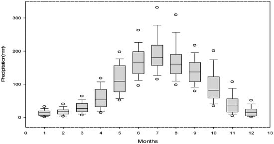 Average monthly precipitation in SWC. The dots show the 5th (lower)/95th (upper) percentiles of monthly precipitation from 1951 to 2009. The short-horizontal lines represent the 90th percentiles, 75th percentiles, medians, 25th percentiles, and 10th percentiles respectively from the top to the bottom of the box symbol.