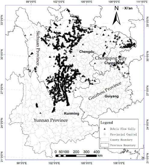 - Debris flows are mainly spread across the mountainous areas around the Sichuan Basin, the border area between Sichuan and Yunnan, eastern and southern Yunnan Province, and eastern Guizhou Province. More than 200 counties were classified as extremely high- or high-density areas of debris-flow gullies, which cover an area of 580,000 km2 and contain a population of 89.97 million people. An analysis of historical records showed that the hazard level is not exactly consistent with the regional debris-flow gully density. The hazard level is highest in the high-density counties and not in the extremely high-density areas; in the high-density areas, the annual frequency of extremely large-scale debris flows reaches 0.36 and small- and medium-scale events occur almost every year.