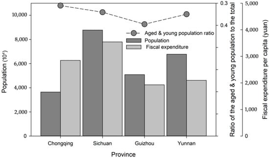 Demographic data that influence vulnerability were collected and calculated from the statistical data of the 2009 yearbooks of provinces such as Sichuan, Yunnan, Guizhou, and Chongqing, alongside the fifth census in China in 2000. These data include the total population, employed and unemployed populations, peasant population, populations of different age groups, number of students in senior high school, fiscal expenditures, GDP, number of beds in hospitals or clinics, etc. A brief statistic shows that Sichuan has the largest population of the four provinces in SWC (Figure 4). The fiscal expenditure per capita in Sichuan province is also the biggest of all, reaching 3543.00 Chinese yuan. Ratio of the population younger than 16 or older than 60 to the total ranges from 0.32 to 0.39. These data were employed to estimate the annual loss of at-risk elements.