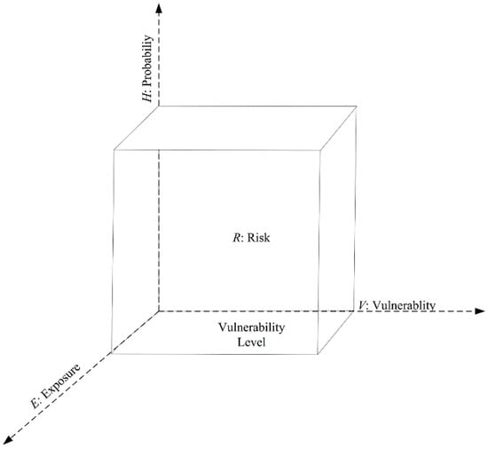 The investigation of debris-flow risk in this paper involves two steps: a hazard assessment and a vulnerability assessment. Three factors are involved in this method, namely, the occurrence probability of debris flows, the vulnerability of an at-risk element and its exposure. We can use the volume of a cuboid to represent the method (Figure 5), in which the rectangular height represents the disaster hazard which varies with the probability and intensity of a specific debris flow; the basal area, which is calculated from the vulnerability and exposure (represented as the width and length, respectively, in Figure 5), expresses the level of vulnerability. According to Figure 5, the following formula was used in our investigations [,,,]