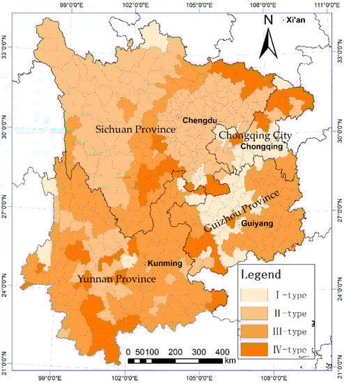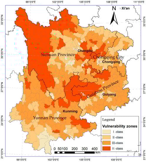where λi is the factor loadings of the common factors. The population vulnerability in SWC was classified into four types with equal intervals based on the composite scores. The results were mapped and shown in Figure 8.