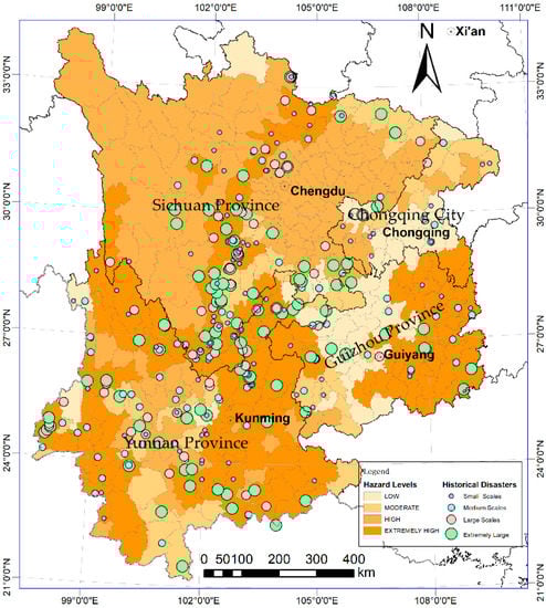 These results can be verified by analyzing the distribution of debris-flow disaster records in Figure 7, which shows that disaster records (especially on large and extremely large scales) are far more likely to be found in extremely high hazard zones. These results have some practical significance. The spatial distributions of debris-flow disaster hazards can also be found in Figure 7, in which the most hazardous locations are the central strip that extends from Qingchuan in the north to Huili in the south, the bordering area between Sichuan and Yunnan, the western and southeastern regions of Yunnan, and the eastern half of Guizhou. Counties in most of Chongqing, the central area of Guizhou and Yunnan, are characterized by low or moderate hazard zones.