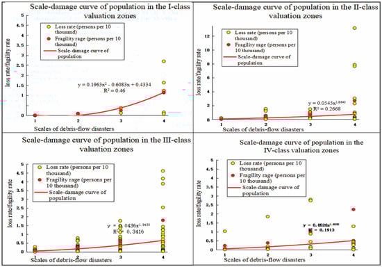 Eleven records of debris-flow disasters were found in the I-class vulnerability zone (Figure 9). The loss rates (i.e., the ratio of the death toll in a disaster to the total population that was exposed) range from 0.07 to 2.70 persons for every 10 thousand people. A total of 52 records were discovered in the II-class zone, with loss rates ranging from 0.01 to 13.16 persons per 10 thousand people. A total of 94 records were found in the III-class zone, with a minimum loss rate of 0.01 persons per 10 thousand people and a maximum of 8.64 persons per 10 thousand people. A total of 32 records were found in the IV-class zone, with loss rates ranging from 0.01 to 14.67 persons per 10 thousand people. These results demonstrate that more debris-flow disasters are found in III-class and II-class zones than in other zones. Therefore, it is not rigorous to say that the vulnerability level generally increases from the I-class to IV-class zones. The damage-scale curves in Figure 9 yield similar conclusions. The highest R2 value in the I-class zone is only 0.46. The values of the other zones are all lower than 0.4, which reflect much lower reliability. These values fail to directly explain the vulnerability levels. Therefore, fragility rates—i.e., the rates of expected loss, were calculated instead to reflect the vulnerability levels of each zone—which were estimated by using Equation (5) in Section 4.3.3 and are listed in Table 7.