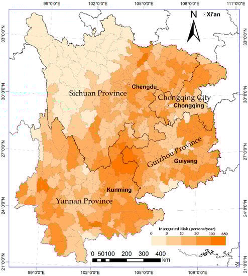 Figure 10 shows that this risk gradually increases from the southeastern region of the study area and reaches a maximum value of over 100 persons/year at the Jiangyou–Zhaotong–Baoshan Line before decreasing to the northwest. Of the 4 provinces, Yunnan is characterized by its extremely high risk: 34.4% of its counties (43 of a total 125) have a risk of over 30 persons/year. The risk in Zhaotong and Honghe reaches over 500 persons/year, and the total risk in the entire province reaches 4578 persons/year. Sichuan Province is characterized by high risk, with a total risk of 2800 persons/year. Of the 161 counties that were studied here, nearly one-fifth of these counties yielded a risk of more than 30 people; these counties are scattered in the Sichuan Basin and the border area between Yunnan and Sichuan. Guizhou Province has a moderate risk: counties in its eastern and southeastern region and in the boundary area between Guizhou and Yunnan have a risk of more than 30 persons. Chongqing City is characterized by low risk.