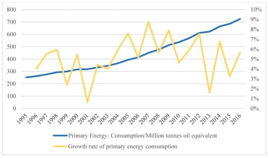Figure 2). In the period of 1995–2016, India’s primary energy consumption showed an upward trend, and the growth rate was about 5.1% per year on average.