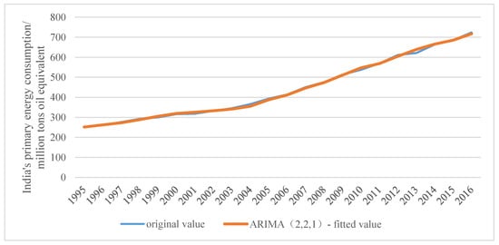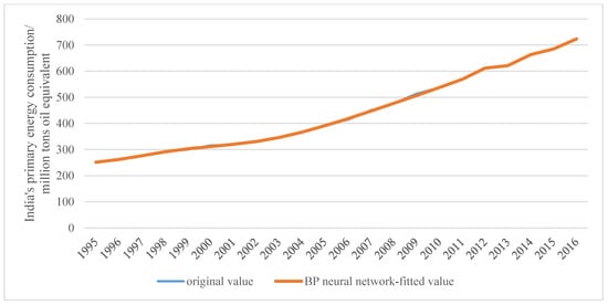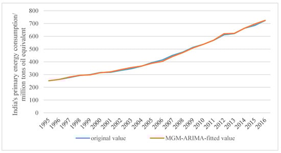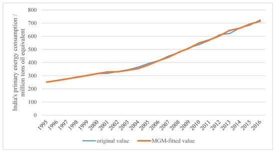 Figure 3, the fitted value of the MGM is very close to the original value; however, there is a difference for the year 2013. The reason for this is that India’s primary energy consumption in 1995–2016 showed a rising trend, but it slowed down suddenly in 2013, as illustrated in