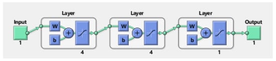 The first step is to establish a BP neural network. We used the special function ‘newff’ to determine the numbers of layers, the number of nodes, and the transfer function, such as the following: ‘net = newff ([−1,1],[4,4,1])’. After establishing the network, we needed to set these values.