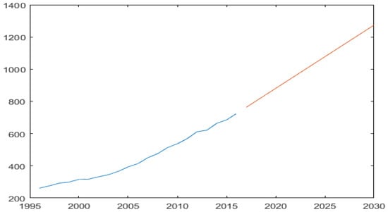 The third step is to obtain the fitted value (1995–2016) and the predicted value (2017–2030) with EXCEL. As is shown in