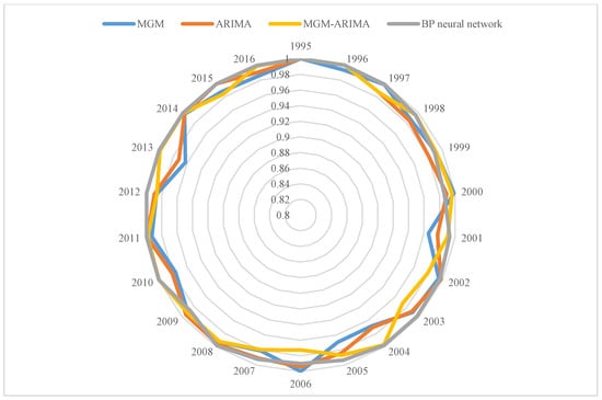 Figure 11, all four models have high accuracy above 95%. Unlike those in past research, our models are based on three theories, which overcomes the limitations that the conflicts between the results are ignored, precision is difficult to ensure, and it is hard to find a better model without comparison. The comparison of multiple models’ precision indicates that the combination model (MGM-ARIMA) has higher accuracy than a single model (MGM and ARIMA), and the BP neural network is the most reliable among all models.