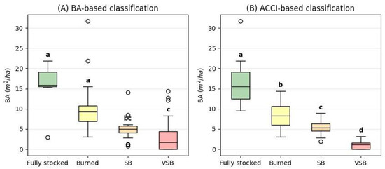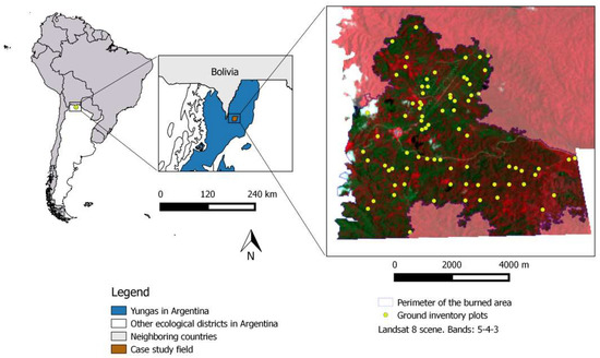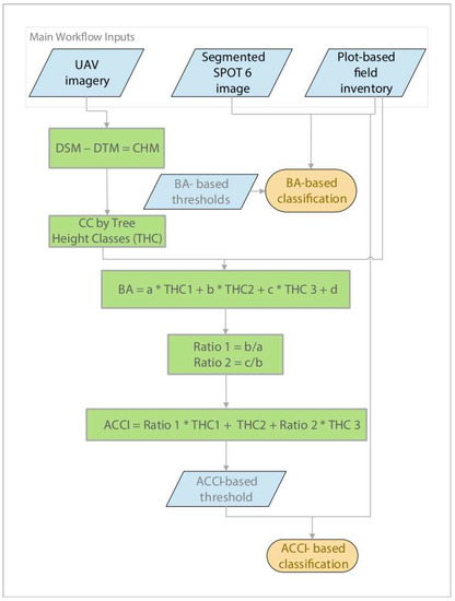 In northern Argentina, the assessment of degraded forests is a big challenge for both science and practice, due to their heterogeneous structure. However, new technologies could contribute to mapping post-disturbance canopy cover and basal area in detail. Therefore, this research assesses whether or not the inclusion of partial cover unmanned aerial vehicle imagery could reduce the classification error of a SPOT6 image used in an area-based inventory. BA was calculated from 77 ground inventory plots over 3944 ha of a forest affected by mixed-severity fires in the Argentinian Yungas. In total, 74% of the area was covered with UAV flights, and canopy height models were calculated to estimate partial canopy cover at three tree height classes. Basal area and partial canopy cover were used to formulate the adjusted canopy cover index, and it was calculated for 70 ground plots and an additional 20 image plots. Four classes of fire severity were created based on basal area and adjusted canopy cover index, and were used to run two supervised classifications over a segmented (algorithm multiresolution) wall-to-wall SPOT6 image. The comparison of the Cohan’s Kappa coefficient of both classifications shows that they are not significantly different (
