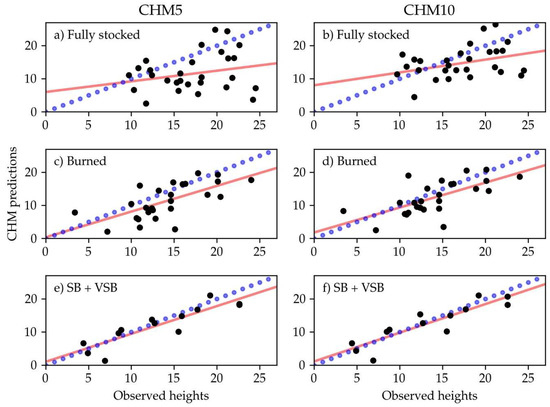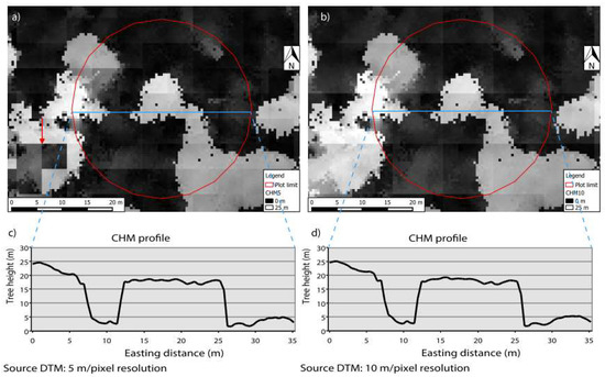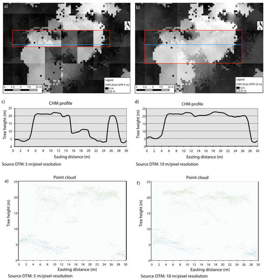 t-test with 95% of confidence). Additionally, UAV-derived canopy height model estimates of tree height were compared with field measurements of 71 alive trees. The canopy height models underestimated tree height with an RMSE ranging from 2.8 to 8.3 m. The best accuracy of the canopy height model was achieved using a larger pixel size (10 m), and for lower stocked plots due to high fire severity.