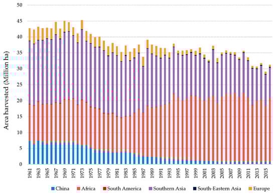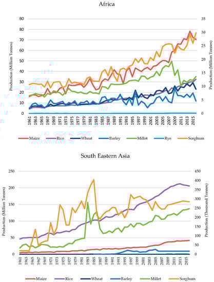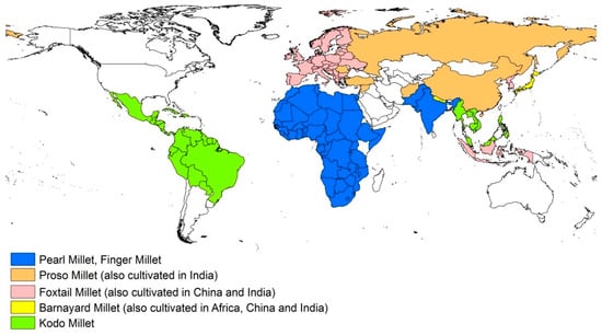 - International Crops Research Institute for the Semi-Arid Tropics; Food and Agriculture Organization of the United Nations. The World Sorghum and Millet Economies: Facts, Trends, and Outlook; International Crops Research Institute for the Semi-Arid Tropics; Food and Agriculture Organization of the United Nations: Patancheru, India; Rome, Italy, 1996. [Google Scholar]