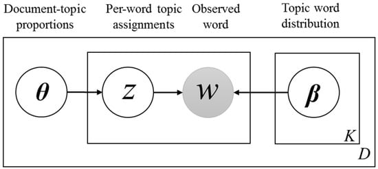 Latent Dirichlet Allocation (LDA) [16] is the most popular topic model discussed in the literature. The way LDA operates is by asking the following question: “What is the latent structure that likely generated the observed collection?” (p. 79). The documents and the words (w) in those documents are observed, but the topic distributions for each document (θ), the topic assignment for each word in each topic (z), and the term distributions over topics (β) are considered latent (or hidden) structures (Figure 1). This leads to a generative process whose goal is to discover the topic structure (θ, z, and β), which can explain the observed word (w). Figure 1 graphically represents this generative process.