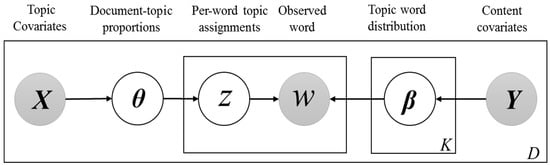 Structural Topic Modeling (STM) [17,33] is a relatively new probabilistic topic model, incorporating covariates or additional document-level information in the process of inferring topics. This makes STM very suitable for computational social science (or business) research using text data. Specifically, STM adds two additional components to the LDA model: topic prevalence and topic content (Figure 2). Topic prevalence allows such numerical covariates (X) as report year, company size, and revenues, to influence the topic proportion (θ). This is done by applying a logistic normal linear prior (θ ~ LogisticNormal (X)), instead of a Dirichlet prior (θ ~ Dirichlet (α)). Thus, for example, researchers can examine whether topic prevalence (e.g., environmental dimension) has changed over the years (X). In this case, the covariate variable “year” (X) affects per-document topic proportions (θ). Using a multinomial logit function, STM also allows researchers to test whether categorical covariates (Y) affect per-topic term distributions (β).