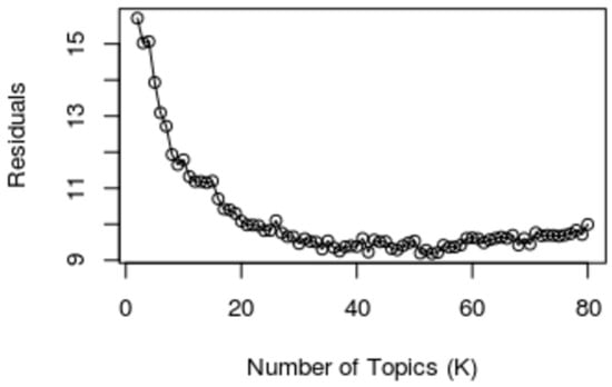 The STM R package was used for model selection and topic modeling. Topic modeling is an unsupervised content analytics algorithm, and there is only one input—the number of topics (k) being searched—required from researchers. The decision for the optimal k should be made, because it is possible that many topic models can be constructed with different k values in the same corpus. To select the optimal k value, there are different techniques—cross-validation, residuals, semantic coherence—, which is the model selection process [17,32,36]. These methods vary in terms of interpretability, scalability, and other measurements. This study used the mixed methods to determine the optimal number of topics (k). First, the model fit was estimated by comparing the residuals of the models with the different k (from 2 to 80). Figure 4 shows the result of an analysis of residuals [37] available in the STM R package. The result demonstrates the best model fit when k is between 30 and 50.