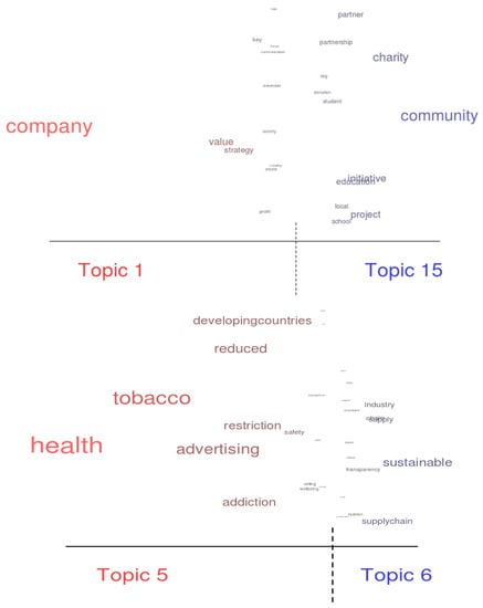 For illustration purposes, a plot was created to show shared words and distinctive words between Topic 1 and Topic 15. Figure 5 indicates that (1) Topic 1 is about business and strategy, while Topic 15 is about charity for community and education, and (2) Topic 5 is about health-related issues, and Topic 6 is about sustainable supply chain. Topic 1’s top words are company and strategy, which are quite distinct from Topic 15’s top words such as community, charity, and partner. Likewise, there are distinctive words, not shared words, between Topic 5 and 6, indicating these topics are not related (more discussion in Section 4.2 topic correlation).
