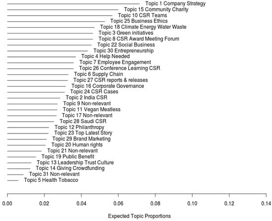 Also, since this study analyzed Twitter posts, there were topics related to CSR events, announcements, jobs, reports, and conferences. For example, Topic 4 (help, need, want, know, ngo, etc.) is largely about NGO volunteering and help wanted. Topic 10 has top words such as great, work, team, and woman and is labeled CSR team. Topic 26 is related to CSR conferences (learn, look, conference, video, etc.). Topic 27 is represented by top words such as report, launch, global, annual, and release (CSR reports).