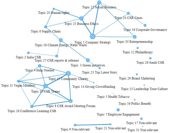 Network visualization was constructed to understand how different topics are related to each other (Figure 7). Nodes and node sizes are topics and their expected topic proportions respectively. For example, the node sizes of Topic 1 (company strategy) and Topic 15 (community charity) are bigger than other nodes. The width of edges is based on correlation analysis, which was performed on the document-topic distribution (θ): if two topics (e.g., company strategy, business ethics) tend to co-appear in tweets, this increases the correlation between the two topics. The coefficient score 0.05 was used as the threshold, so the edges whose correlation coefficients are below 0.05 were removed from the network.